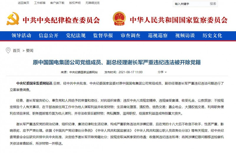 謝長(zhǎng)軍嚴(yán)重違反黨的政治紀(jì)律、組織紀(jì)律、廉潔紀(jì)律和生活紀(jì)律,構(gòu)成嚴(yán)重職務(wù)違法并涉嫌犯罪,且在黨的十八大后不收斂不收手,性質(zhì)嚴(yán)重,影響惡劣,應(yīng)予嚴(yán)肅處理。依據(jù)《中國(guó)共產(chǎn)黨紀(jì)律處分條例》《中華人民共和國(guó)監(jiān)察法》《中華人民共和國(guó)公職人員政務(wù)處分法》等有關(guān)規(guī)定,經(jīng)中央紀(jì)委常委會(huì)會(huì)議研究并報(bào)中共中央批準(zhǔn),決定給予謝長(zhǎng)軍開(kāi)除黨籍處分;按規(guī)定取消其享受的待遇;收繳其違紀(jì)違法所得;將其涉嫌犯罪問(wèn)題移送檢察機(jī)關(guān)依法審查起訴,所涉財(cái)物一并移送。