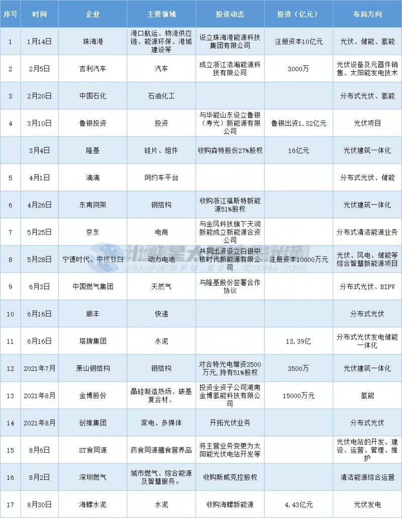 這些企業(yè)中,不乏有如電商巨頭京東、滴滴,快遞巨頭順豐,更有水泥大佬塔牌集團(tuán)、海螺水泥;鋼結(jié)構(gòu)龍頭東南網(wǎng)架、蕭山鋼結(jié)構(gòu);鞋業(yè)大王寶峰時(shí)尚,家電龍頭創(chuàng)維集團(tuán);更有中石化、深圳燃?xì)獾葌鹘y(tǒng)能源企業(yè)涌向光伏行業(yè)。
