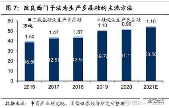 生產(chǎn)高純多晶硅的生產(chǎn)路線有西門子法、改良西門子法、硅烷流化法、冶金法(物理法)等,改良西門子法安全環(huán)保,是應(yīng)用最廣的多晶硅生產(chǎn)工藝路線。改良西門子法技術(shù)成熟,產(chǎn)品質(zhì)量最高,可以達(dá)到電子級(jí)多晶硅的純度。根據(jù)三孚股份招股說(shuō)明書(shū),企業(yè)實(shí)際生產(chǎn)過(guò)程中產(chǎn) 生產(chǎn) 1 噸多晶硅需要耗用三為 氯氫硅約為 1-1.5 噸,短期內(nèi)其他技術(shù)迭代改良西門子法的可能性較小,預(yù)計(jì)未來(lái)多晶硅生產(chǎn)技術(shù)改進(jìn)對(duì)三氯氫硅消耗量的影響有限,三氯氫硅需求主要取決于下游多晶硅產(chǎn)能及太陽(yáng)能電池組裝業(yè)務(wù)需求。