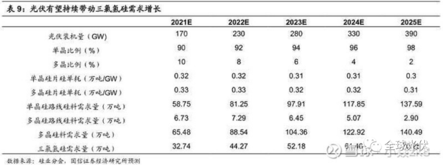 根 據(jù) 測(cè) 算,2021-2025 年 多 晶 硅 對(duì) 于 三 氯 氫 硅 的 需 求 量 分 別 為32.7/44.3/52.2/61.5/70.2 萬(wàn)噸,2021-2025 年硅烷偶聯(lián)劑對(duì)于三氯氫硅的需求量分別為 18.6/19.9/21.3/22.8/24.4 萬(wàn)噸。因此 2021-2025 年三氯氫硅總需求分別為 51.4/64.2/73.5/84.36/94.7 萬(wàn)噸,今明兩年三氯氫硅供需緊平衡,供需缺口分別為 0.4、5.7 萬(wàn)噸,有望持續(xù)維持高景氣度。