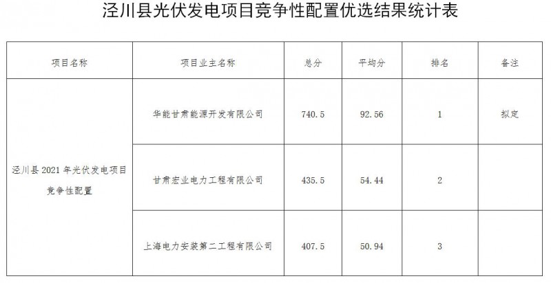 涇川縣2021年光伏發(fā)電項(xiàng)目競(jìng)爭(zhēng)性配置工作優(yōu)選結(jié)果公示