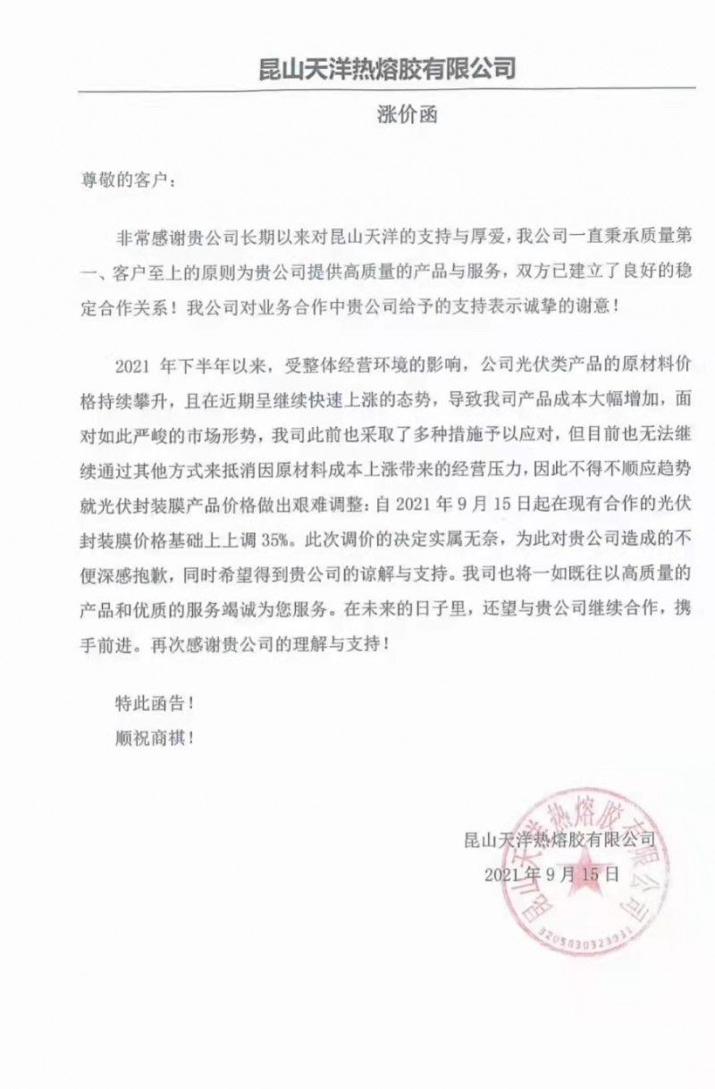 9月15日,據(jù)索比光伏網(wǎng)消息,昆山天洋熱熔膠有限公司、上海海優(yōu)威新材料股份有限公司紛紛發(fā)布光伏膠膜漲價函,兩家公司均表示,受近期光伏原材料價格上漲趨勢的影響和壓力,對光伏膠膜作出價格調(diào)整。