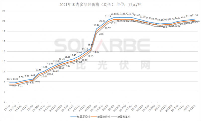 9月15日,硅業(yè)分會發(fā)布了本周國內(nèi)多晶硅成交價。其中單晶復(fù)投料價格區(qū)間在20.6-21.9萬元/噸,成交均價小幅上漲至21.38萬元/噸,周環(huán)比漲幅為0.71%;單晶致密料價格區(qū)間在20.4-21.7萬元/噸,成交均價上漲至21.15萬元/噸,周環(huán)比漲幅為0.62%。