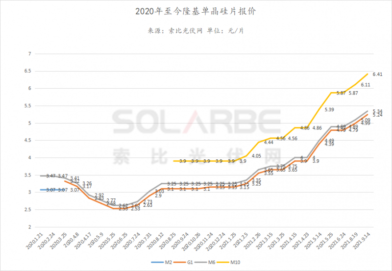 而隆基也在9月14日發(fā)布了新一期硅片價格公示。G1、M6、M10分別上漲0.25、0.25、0.3元/片,報價分別為5.24、5.34、6.41元/片。