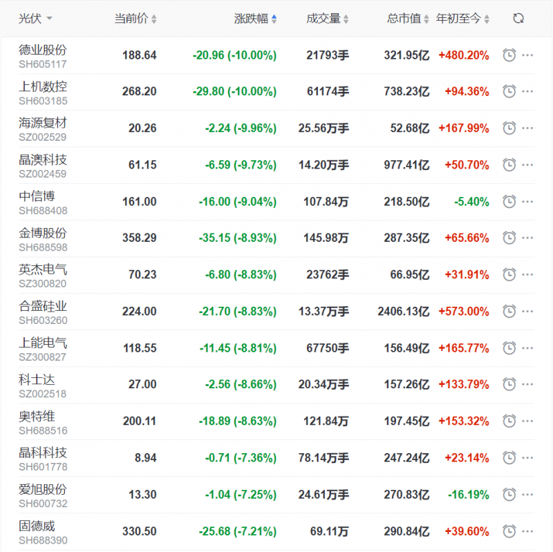 同樣,索比光伏網(wǎng)跟蹤隆基硅片報價發(fā)現(xiàn),隆基硅片報價分別在3月、4月、6月底保持價格穩(wěn)定,2021年全年未曾出現(xiàn)降價,M10最新報價直接沖上6.14元/片,較年初漲幅超64%。電池端來看,通威本月電池片報價還未發(fā)布,但業(yè)內(nèi)人士普遍認(rèn)為,電池片價格也將上漲。而近期掀起的又一波漲價潮,也最終反應(yīng)在資本市場。截止中午休盤時間,德業(yè)股份、上機(jī)數(shù)控主板跌停下跌10%、海源復(fù)材下跌9.96%、晶澳科技下跌9.73%、中信博下跌9.04%。