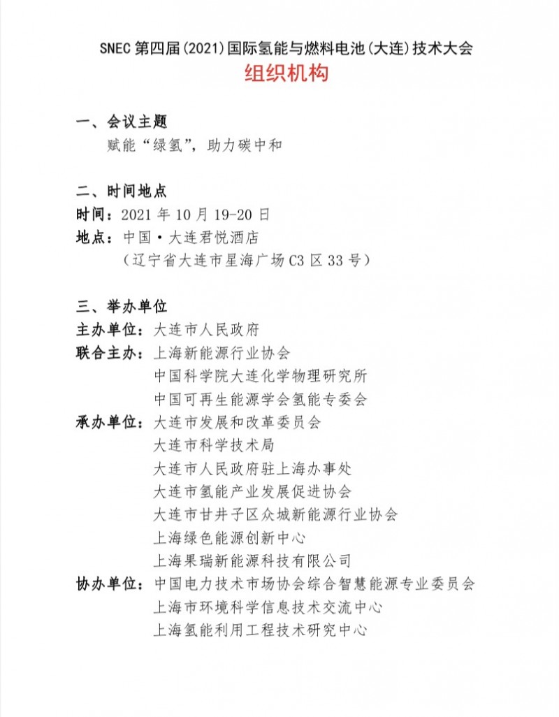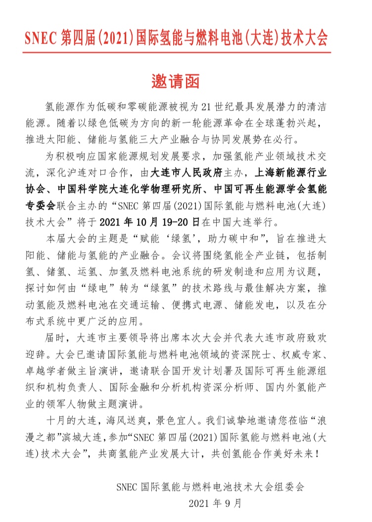“SNEC 第四屆(2021)國際氫能與燃料電池(大連) 技術(shù)大會(huì)”將于 2021 年 10 月 19-20 日在中國大連舉行,以下是邀請(qǐng)函內(nèi)容: