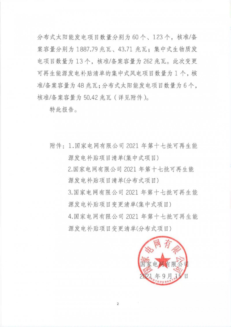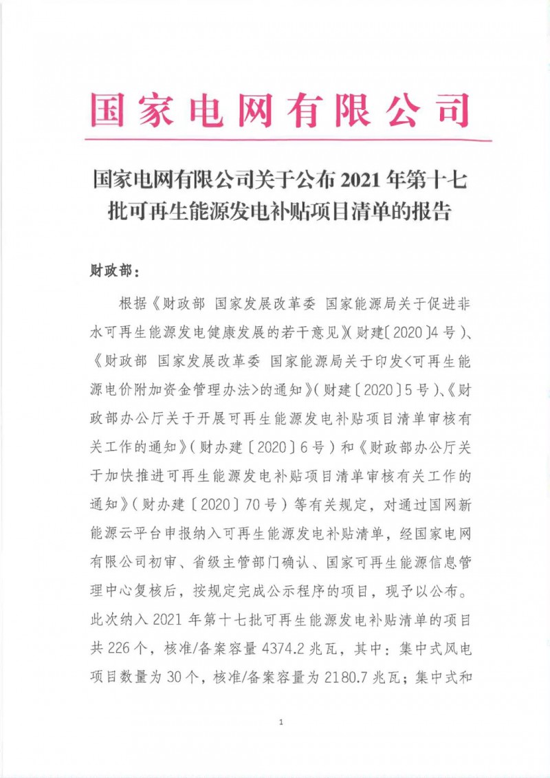 2021年9月15日,我公司已將完成公示的2021年第十七批可再生能源發(fā)電項(xiàng)目補(bǔ)貼項(xiàng)目清單上報(bào)國家主管部門,第十七批項(xiàng)目清單及后續(xù)項(xiàng)目審核進(jìn)展情況,請登錄新能源云平臺查詢。