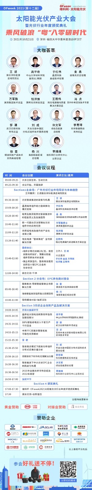 在此背景下,由高科技行業(yè)門戶OFweek維科網(wǎng)主辦,OFweek太陽(yáng)能光伏網(wǎng)承辦的“OFweek 2021(第十二屆)太陽(yáng)能光伏產(chǎn)業(yè)大會(huì)暨光伏行業(yè)年度頒獎(jiǎng)典禮”——乘風(fēng)破浪“粵”入零碳時(shí)代將于2021年10月21日在深圳福田大中華喜來登酒店6F漢廳隆重舉辦。
