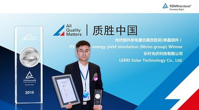 無錫2017年3月14日電 /美通社/ -- TUV萊茵“質(zhì)勝中國”光伏盛典昨日在無錫拉開帷幕,備受業(yè)界關(guān)注的2017“質(zhì)勝中國優(yōu)勝獎(jiǎng)”榜單正式出爐,獲得“質(zhì)勝中國優(yōu)勝獎(jiǎng)”,即證明該產(chǎn)品擁有卓越的質(zhì)量。作為最受關(guān)注的“光伏組件發(fā)電量仿真優(yōu)勝獎(jiǎng)”壓軸發(fā)布。在模擬了德國科隆、中國大同、日本熊本、印度金奈、美國洛杉磯五個(gè)地區(qū)環(huán)境,經(jīng)歷嚴(yán)格嚴(yán)苛的實(shí)測(cè)之后,完成了“光伏組件發(fā)電量仿真競賽”的發(fā)電量測(cè)試。最終, 樂葉光伏 60 片單晶組件以實(shí)際發(fā)電總數(shù)據(jù)第一的成績獲得單晶組第一名,獲得“ 光伏組件發(fā)電量仿真優(yōu)勝獎(jiǎng) ”單晶唯一獎(jiǎng)項(xiàng);同時(shí)也以全部組件中第一名的成績證明了其單晶組件發(fā)電能力的先進(jìn)性。