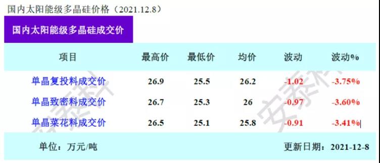 與12月1日相比,多個等級多晶硅格開始松動下滑,這也是8月11日以來,硅料價格首次下調。與本輪漲價前相比,目前硅料價格漲幅仍在30%以上。