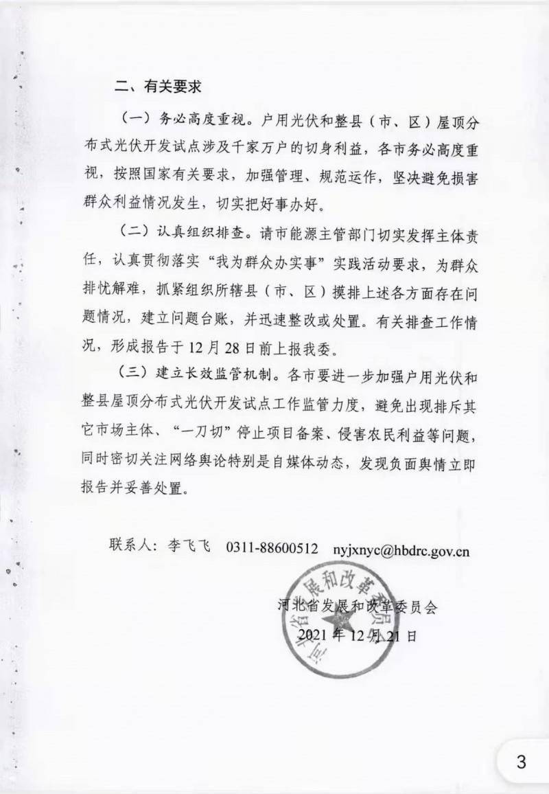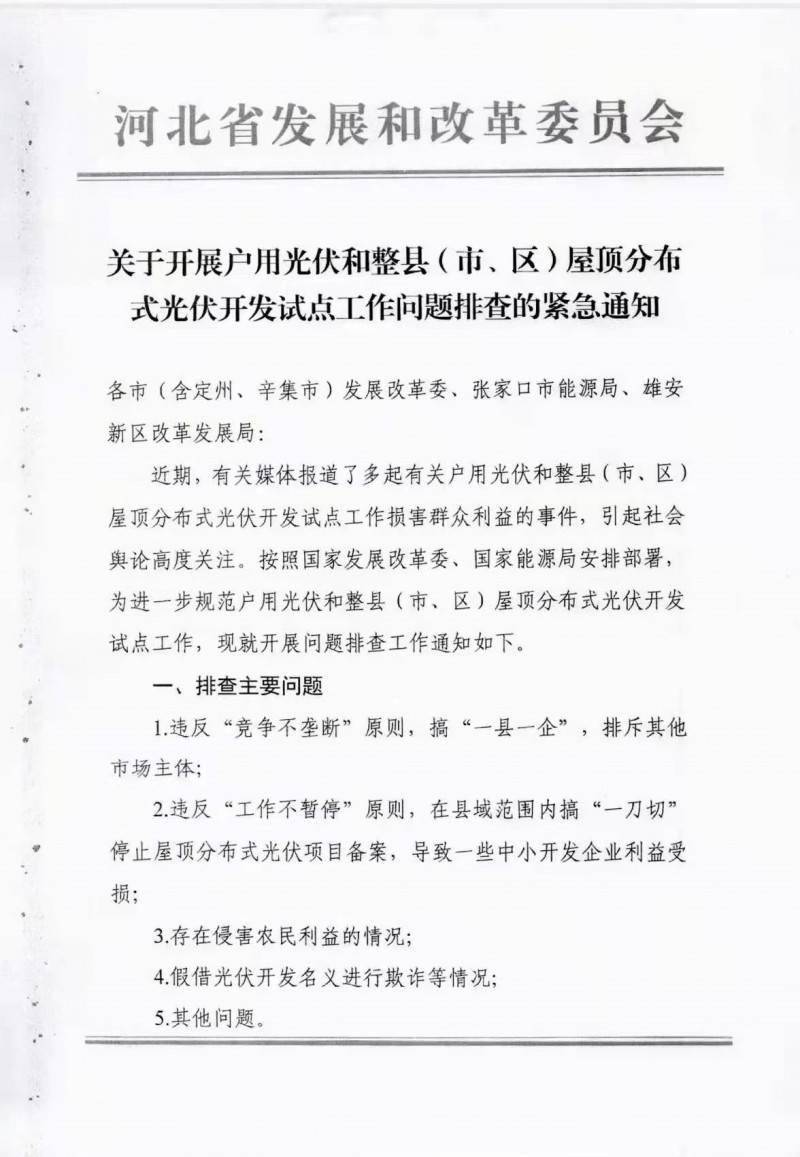 文件指出:近期有關(guān)媒體報(bào)道多起有關(guān)戶用光伏和整縣(市、區(qū))屋頂分布式光伏開(kāi)發(fā)試點(diǎn)工作損害群眾利益的事件,引發(fā)社會(huì)輿論高度關(guān)注。按照國(guó)家發(fā)展改革委、國(guó)家能源局安排部署,為進(jìn)一步規(guī)范戶用光伏和整縣(市、區(qū))屋頂分布式光伏開(kāi)發(fā)試點(diǎn)工作,開(kāi)展問(wèn)題排查工作。有關(guān)排查工作情況,于12月28日上報(bào)。