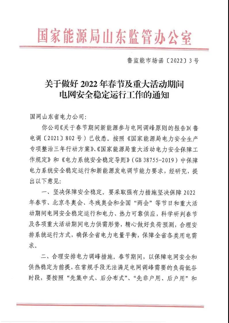 根據(jù)文件,要合理安排電力調(diào)峰措施。春節(jié)期間,以保障電網(wǎng)安全和供熱穩(wěn)定為前提,在常規(guī)手段無法滿足電網(wǎng)調(diào)峰需要的負(fù)荷低谷時(shí)段,要按照“先集中式、后分布式”、“先非戶用、后戶用”和“公平、公正、公開”的原則,合理安排新能源電力參與調(diào)峰,以保障系統(tǒng)安全穩(wěn)定運(yùn)行。