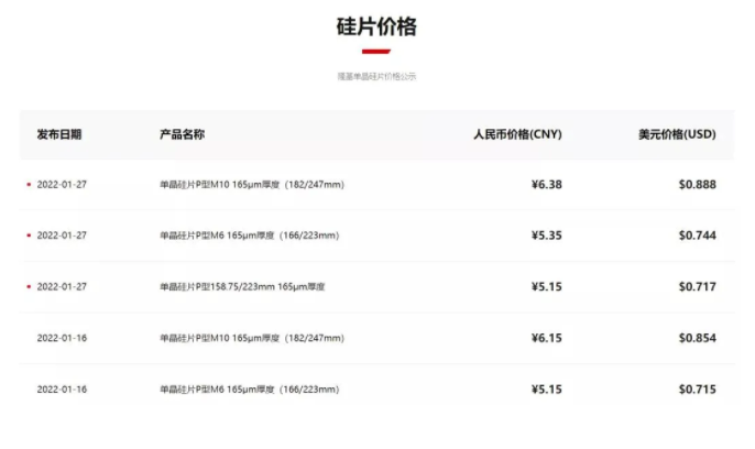 1月26日,中環(huán)股份在公眾號上發(fā)布了最新的硅片價格,與上次價格相比,本次價格對150μm、160μm進行了全面上調(diào)。以160μm為例,不同規(guī)格的硅片價格上調(diào)0.4~0.92元/片。價格調(diào)整將于1月27日開始執(zhí)行。