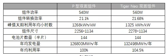 測試對比發(fā)現(xiàn),采用轉(zhuǎn)換效率為21.68%的Tiger Neo N型560W雙面組件的光伏電站,年均發(fā)電量為132498 MWh,而采用轉(zhuǎn)換效率為21.1%的P型540W雙面組件的光伏電站,年均發(fā)電量僅為126800 MWh。與P型雙面組件相比,Tiger Neo N型雙面組件具有更高的轉(zhuǎn)換效率及發(fā)電量,發(fā)電量增益高出同類P型雙面組件4.5%。