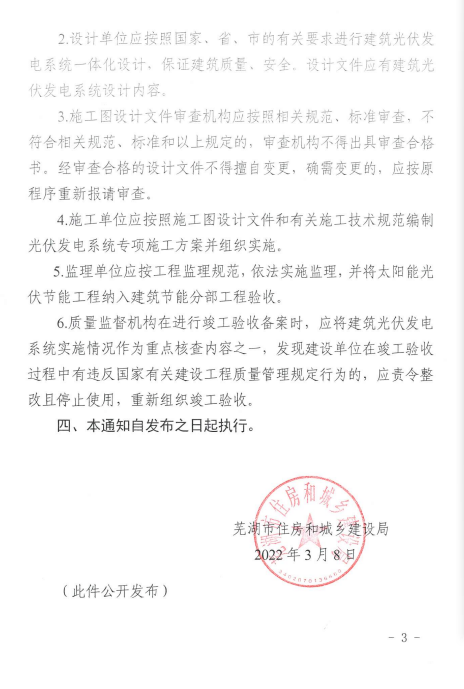 3月10日,安徽蕪湖市住建局發(fā)布關(guān)于加快建設(shè)領(lǐng)域光伏發(fā)電推廣應(yīng)用的通知,通知指出,全市范圍內(nèi)新建、改建、擴(kuò)建的工業(yè)和民用建筑項(xiàng)目屋面應(yīng)按光伏發(fā)電、光伏與建筑一體化設(shè)計(jì)、建造。其中,工業(yè)建筑單體屋頂面積1000平方米以上應(yīng)同步安裝光伏發(fā)電系統(tǒng),太陽(yáng)發(fā)電組件面積不少于屋頂面積的70%。
