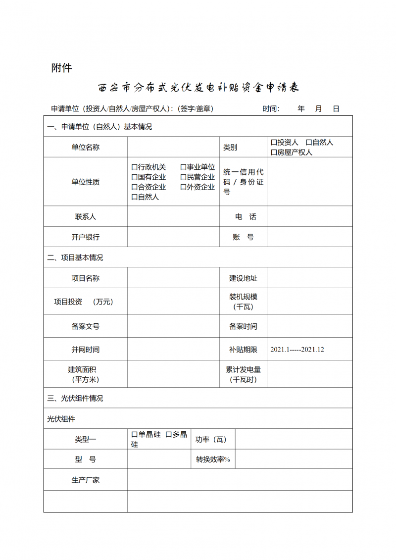 為落實(shí)西安市人民政府辦公廳印發(fā)《關(guān)于促進(jìn)光伏產(chǎn)業(yè)持續(xù)健康發(fā)展的實(shí)施意見的通知》(市政辦發(fā)〔2018〕32號)有關(guān)要求,根據(jù)年度工作安排,現(xiàn)對全市2021年度分布式光伏補(bǔ)貼資金申報工作明確如下: