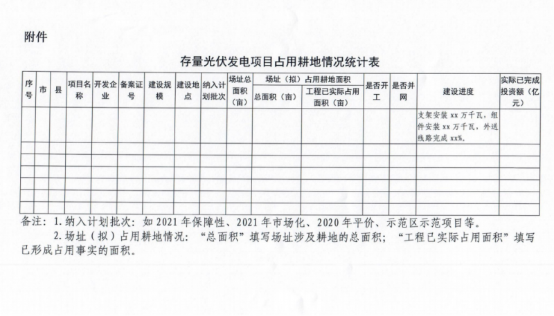 3月11日,河北省能源局啟動(dòng)存量光伏電站占用耕地摸底統(tǒng)計(jì)工作,文件要求對照自然資源部門土地年度變更調(diào)查數(shù)據(jù)庫,對已列入省年度計(jì)劃、尚未辦理建設(shè)用地審批手續(xù)的存量光伏發(fā)電項(xiàng)目占用耕地情況進(jìn)行摸底統(tǒng)計(jì)。附表信息統(tǒng)計(jì)中包括項(xiàng)目名稱、開發(fā)企業(yè)、備案證號(hào)、建設(shè)規(guī)模及地點(diǎn)、納入計(jì)劃批次以及場址總面積、已占用面積以及建設(shè)進(jìn)度等多項(xiàng)詳細(xì)信息。