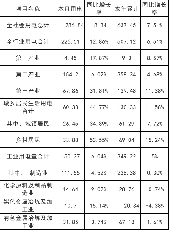 (一)全社會用電量情況。全省全社會用電量286.84億千瓦時(shí),同比增加18.34%;累計(jì)用電量637.45億千瓦時(shí),同比增加7.51%。