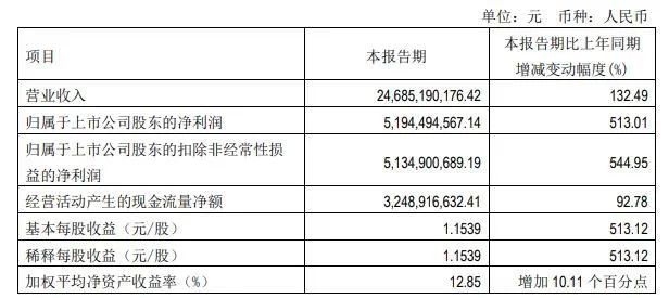 4月25日,通威股份公布2022年第一季度報告,實(shí)現(xiàn)凈利潤51.94億元,同比增長513.01%;實(shí)現(xiàn)營收246.85億元,同比增長132.49%。