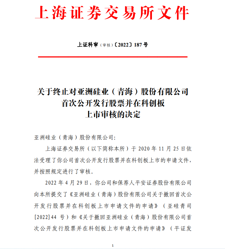 5月1日,上交所披露關(guān)于終止對亞洲硅業(yè)(青海)股份有限公司首次公開發(fā)行股票并在科創(chuàng)板上市審核的決定:4月29日,亞洲硅業(yè)(青海)股份有限公司因發(fā)行人撤回發(fā)行上市申請或者保薦人撤銷保薦。根據(jù)規(guī)定,上交所終止其發(fā)行上市審核。