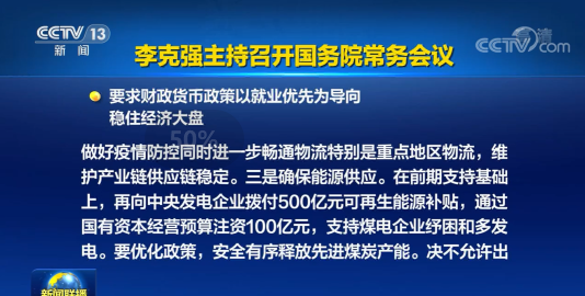 國(guó)務(wù)院總理李克強(qiáng)5月11日主持召開(kāi)國(guó)務(wù)院常務(wù)會(huì)議,會(huì)議要求:確保能源供應(yīng)。在前期支持基礎(chǔ)上,再向中央發(fā)電企業(yè)撥付500億元可再生能源補(bǔ)貼,通過(guò)國(guó)有資本經(jīng)營(yíng)預(yù)算注資100億元,支持煤電企業(yè)紓困和多發(fā)電。