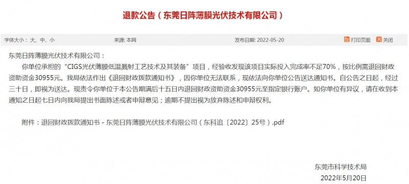 天眼查資料顯示,東莞日陣薄膜光伏技術(shù)有限公司成立于2010年12月24日,注冊(cè)資本為100萬(wàn)美元,經(jīng)營(yíng)范圍包括生產(chǎn)和銷售薄膜光伏模塊,薄膜生產(chǎn)設(shè)備,并提供售后服務(wù)及相關(guān)咨詢服務(wù);設(shè)立研發(fā)機(jī)構(gòu),研究和開發(fā)薄膜光伏生產(chǎn)技術(shù)、薄膜生產(chǎn)設(shè)備。目前,該公司經(jīng)營(yíng)狀態(tài)為吊銷,未注銷。