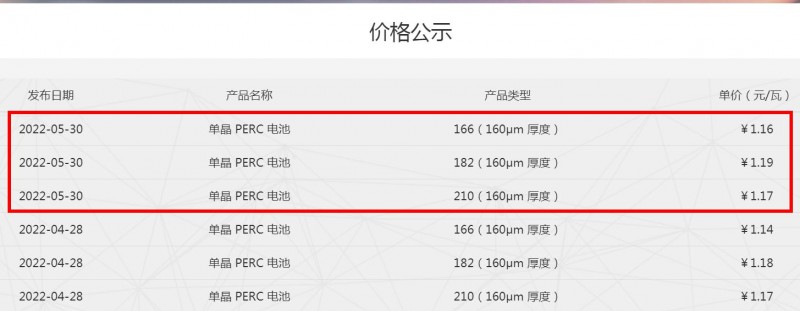 5月30日,通威太陽能發(fā)布單晶PERC電池片最新報價,其中,M6電池片價格上調0.02元/W至1.16元/W,M10電池片價格上調0.01元/W至1.19元/W,G12電池片價格維穩(wěn),保持1.17元/W未變。