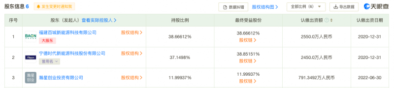 最新股權(quán)信息顯示,百城新能源系上??觳返谝淮蠊蓶|,持股比例約為38.67%,略高于寧德時代。寧德時代為第二大股東,持股比例約為37.15%。最新入股的瀚星投資持股比例約為12.00%,位列第三大股東。