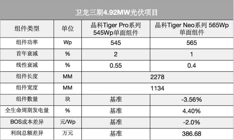 通過對比N型Tiger Neo 565Wp單面組件和P型Tiger Pro 545Wp單面組件,結(jié)果顯示:在高電池轉(zhuǎn)換效率、高發(fā)電量、低衰減率、低溫度系數(shù)等多重優(yōu)勢作用下,Tiger Neo 565Wp單面組件全生命周期下,運行期內(nèi)利潤可增加約386.68萬元(以0.83元/度上網(wǎng)電價計算),為客戶帶來更高利潤。