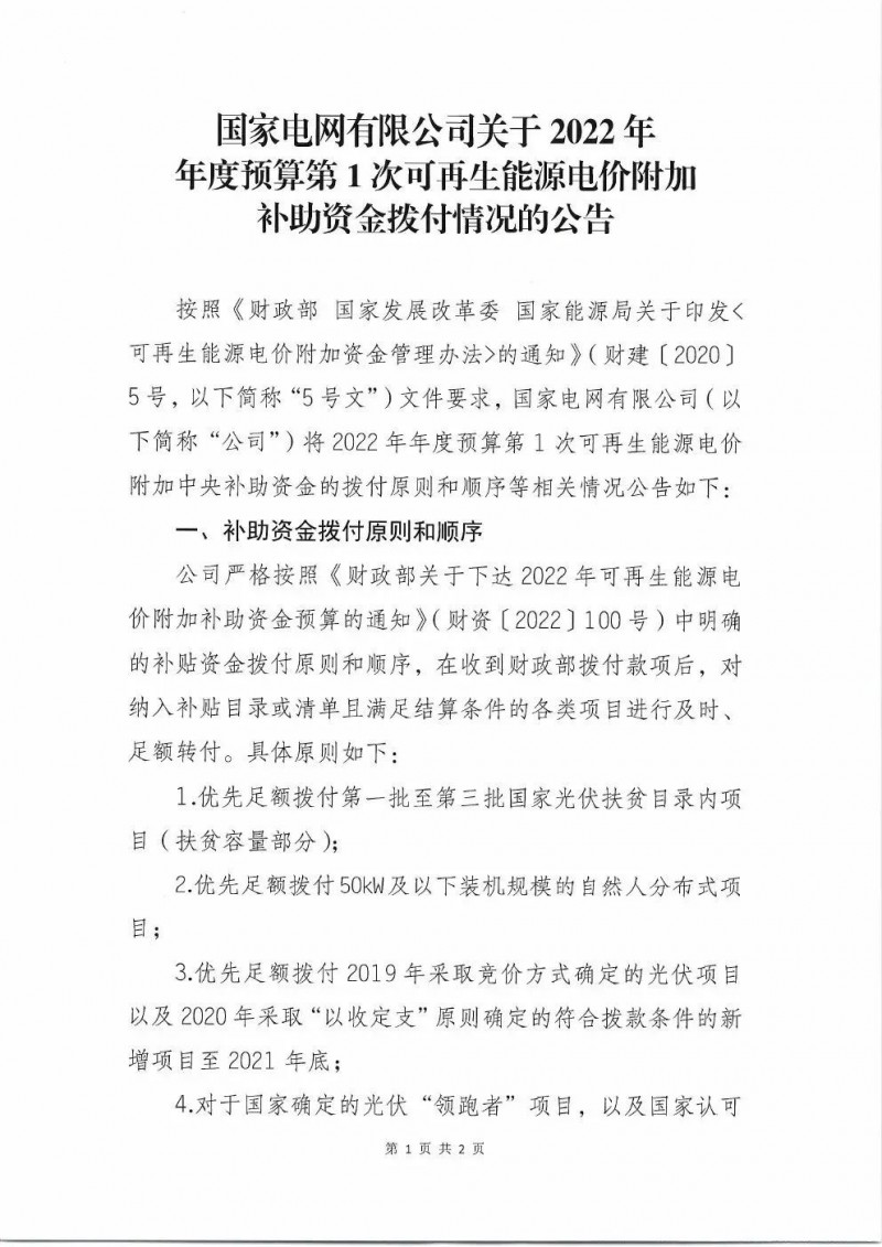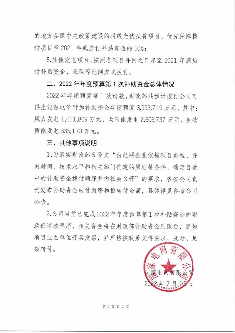 文件指出:2022年年度預(yù)算第1次請款,財(cái)政部共預(yù)計(jì)撥付公司可再生能源電價(jià)附加補(bǔ)助資金年度預(yù)算3,993,719萬元,其中:風(fēng)力發(fā)電1,051,809萬元、太陽能發(fā)電2,606,737萬元、生物質(zhì)能發(fā)電335,173萬元。向財(cái)政部請款程序,相關(guān)資金將在財(cái)政部補(bǔ)助資金到賬后,通知項(xiàng)目業(yè)主單位開具發(fā)票,并嚴(yán)格按政策文件要求,及時(shí)、足額轉(zhuǎn)付。