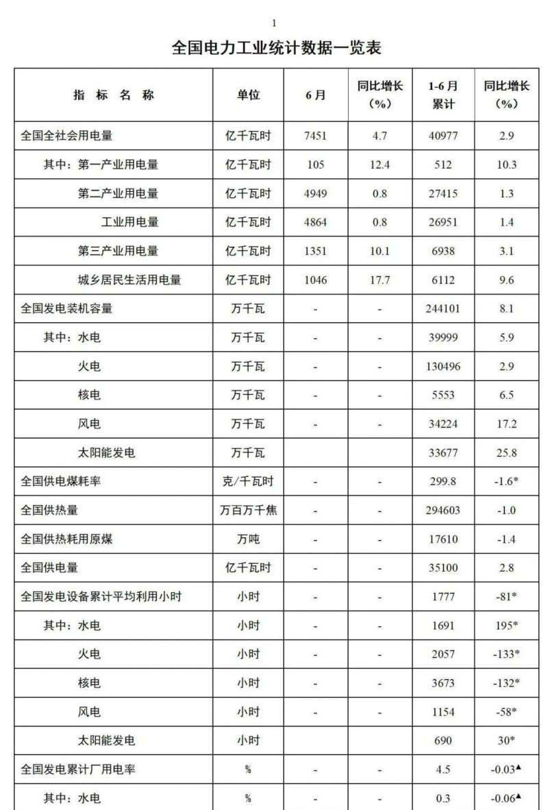 1-6月份,全國(guó)發(fā)電設(shè)備累計(jì)平均利用1777小時(shí),比上年同期減少81小時(shí)。其中,火電2057小時(shí),比上年同期減少133小時(shí);核電3673小時(shí),比上年同期減少132小時(shí);風(fēng)電1154小時(shí),比上年同期減少58小時(shí)。
