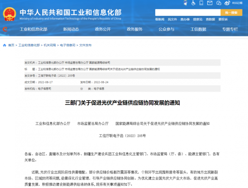 工業(yè)和信息化部辦公廳市場監(jiān)管總局辦公廳國家能源局綜合司關(guān)于促進(jìn)光伏產(chǎn)業(yè)鏈供應(yīng)鏈協(xié)同發(fā)展的通知