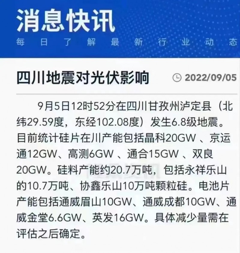 光伏方面,據(jù)了解,目前地震對四川地區(qū)硅料及電池片影響較為有限,對當(dāng)?shù)毓杵a(chǎn)影響相對較大,主要是由于硅片生產(chǎn)在拉棒環(huán)節(jié)對硅棒的垂直度要求較高,廠區(qū)的震感會導(dǎo)致爐料及硅棒的晃動,從而導(dǎo)致斷棒,目前對當(dāng)?shù)厣a(chǎn)具體影響還在評估中。