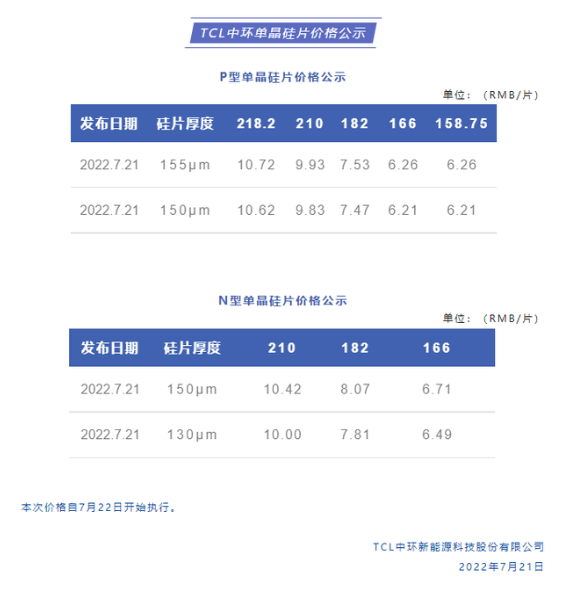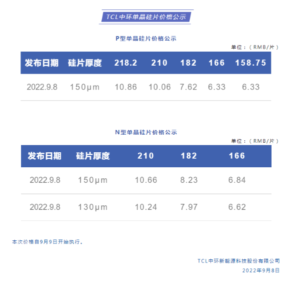 TCL中環(huán)官微9月8日公示公司單晶硅片價(jià)格,對(duì)P型、N型單晶硅片價(jià)格進(jìn)行調(diào)整。