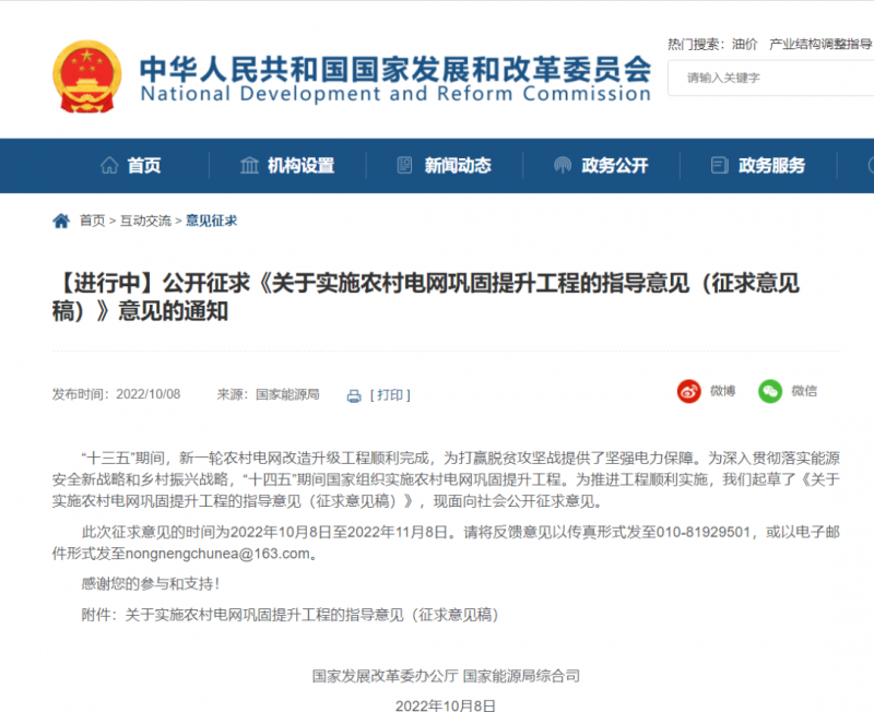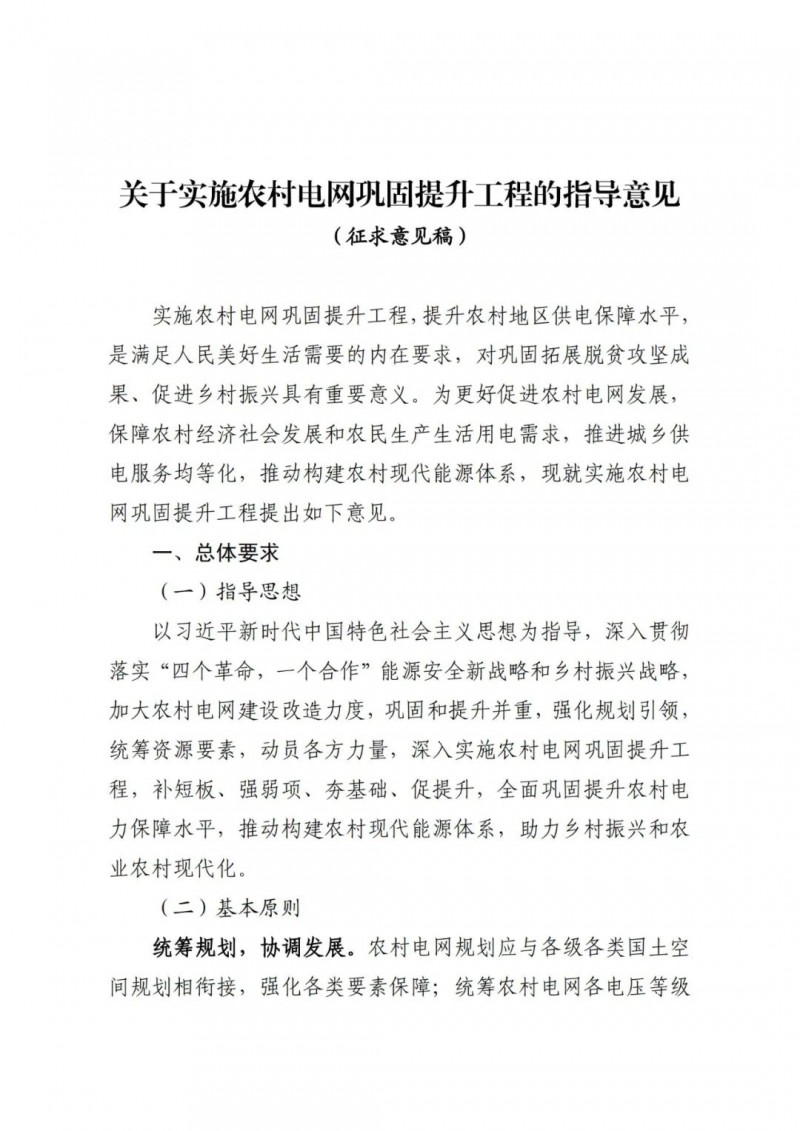 征求意見(jiàn)稿表示,為深入貫徹落實(shí)能源安全新戰(zhàn)略和鄉(xiāng)村振興戰(zhàn)略,“十四五”期間國(guó)家組織實(shí)施農(nóng)村電網(wǎng)鞏固提升工程。為推進(jìn)工程順利實(shí)施,國(guó)家發(fā)改委起草了《關(guān)于實(shí)施農(nóng)村電網(wǎng)鞏固提升工程的指導(dǎo)意見(jiàn)(征求意見(jiàn)稿)》,現(xiàn)面向社會(huì)公開(kāi)征求意見(jiàn)。