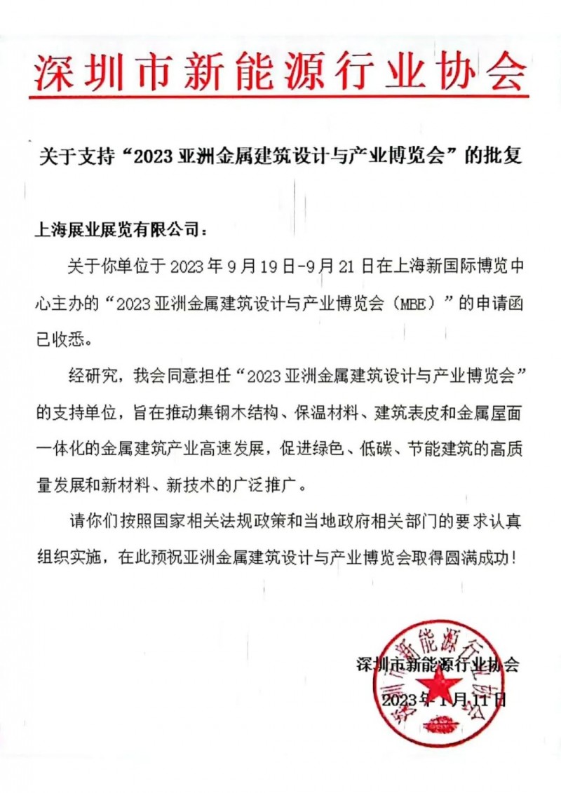 新年伊始,今日MBE亞洲金屬建筑博覽會組委會收到深圳市新能源行業(yè)協(xié)會關(guān)于同意作為展會支持單位的復(fù)函,并同步邀請各會員及相關(guān)單位共襄盛舉。