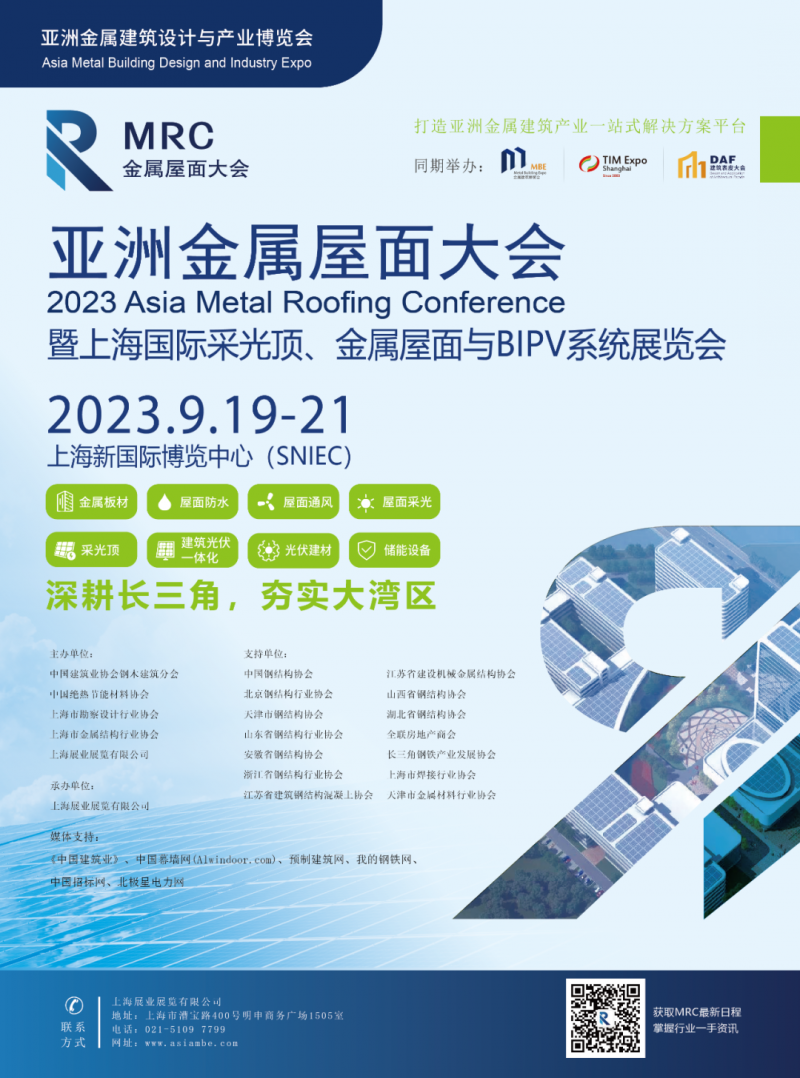 采光頂與金屬屋面是建筑圍護(hù)系統(tǒng)重要的組成部分,對有效提高建筑的環(huán)保節(jié)能功效提供了技術(shù)保證,也帶來了巨大的發(fā)展機(jī)遇。近年來,采光頂和金屬屋面在建筑中得到廣泛應(yīng)用,隨著光伏建筑一體化(BIPV)概念在工商業(yè)建筑及住宅項目中的應(yīng)用場景的升級,為有效的助力“雙碳”目標(biāo),提供了更大的市場需求和更多的應(yīng)用場景。由中國建筑業(yè)協(xié)會鋼木建筑分會、中國絕熱節(jié)能材料協(xié)會、上海市勘察設(shè)計行業(yè)協(xié)會、上海市金屬結(jié)構(gòu)行業(yè)協(xié)會和上海展業(yè)展覽有限公司等單位共同主辦的“2023亞洲金屬屋面大會”將于2023年9月19-21日在上海新國際博覽中心(SNIEC)盛大舉行。