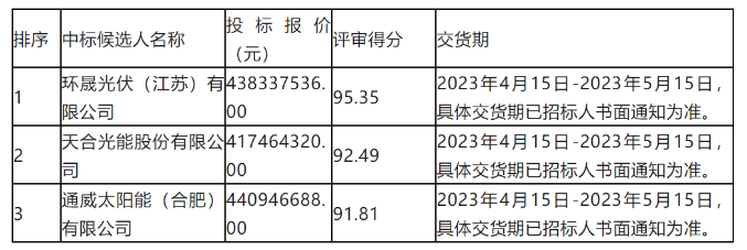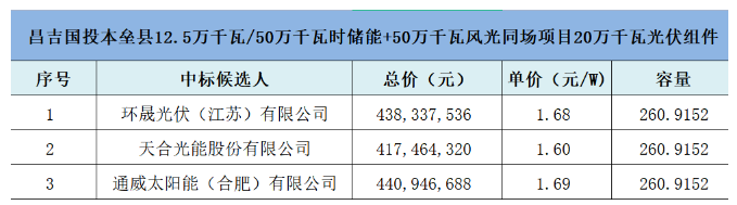 其中,環(huán)晟光伏(江蘇)有限公司以438337536元總報(bào)價(jià),單價(jià)1.68元/W成為第一中標(biāo)候選人;