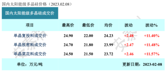 硅業(yè)分會表示,本周硅料價(jià)格延續(xù)上漲走勢,周漲幅在11%左右,其中單晶復(fù)投料主流成交價(jià)在23.0-24.5萬元/噸,最高價(jià)和最低價(jià)之間的價(jià)差略有收窄,但一、二線企業(yè)成交價(jià)仍存在分化,復(fù)投料最低價(jià)在22.0萬元/噸,最高價(jià)有個(gè)別散單在25萬元/噸左右。本周有新訂單成交的企業(yè)數(shù)量超過10家,市場活躍度明顯提升,絕大部分有新成交的企業(yè)訂單已簽至2月中旬,各企業(yè)簽單量都有明顯增加。