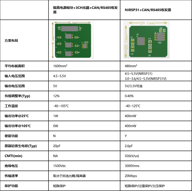 納芯微NIRSP31采用業(yè)內(nèi)領(lǐng)先的片上變壓器技術(shù),單芯片集成了隔離電源和三通道數(shù)字隔離器,并使用先進(jìn)的LGA封裝(4mm×5mm)工藝,相對(duì)于傳統(tǒng)的獨(dú)立隔離電源模塊+光耦/數(shù)字隔離器的方案,極大地減小了PCB布板面積和高度,可進(jìn)一步降低系統(tǒng)成本。