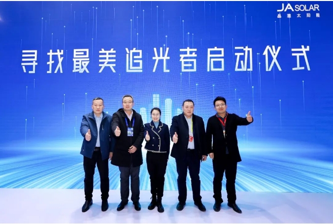 隨后,晶澳科技助理總裁張鳳海,與來自雙杰新能有限公司、德州交投新能源有限責任公司、山東聚輝新能源集團有限公司、安宇光伏能源集團有限公司的代表一起上臺,共同啟動尋找最美追光者活動。