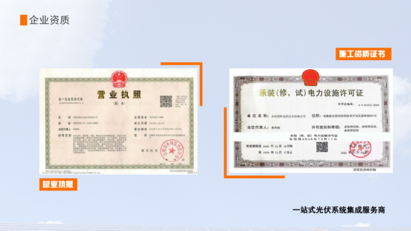 以專業(yè)自有施工隊(duì)伍為基石,電力工程施工總承包貳級(jí)、承裝(修、試)電力設(shè)施許可證四級(jí)相關(guān)資質(zhì)為支柱,以戶用電站、工商業(yè)電站、地面電站的豐富施工經(jīng)驗(yàn)為保障,打造值得信賴、技術(shù)過(guò)硬、資質(zhì)齊全的專業(yè)團(tuán)隊(duì)是光伏EPC板塊的品質(zhì)服務(wù)。
