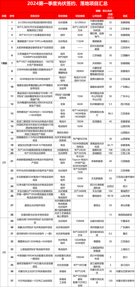 據(jù)不完全統(tǒng)計(jì),2024年第一季度,共有37個(gè)光伏制造項(xiàng)目簽約、落戶。統(tǒng)計(jì)數(shù)據(jù)顯示,相關(guān)項(xiàng)目覆蓋石英坩堝、多晶硅、硅片、電池片和組件等環(huán)節(jié),總投資合計(jì)超1300億元。