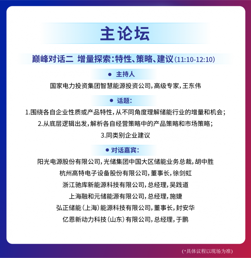 “趨勢(shì)、戰(zhàn)略、前景”這些圍繞頂層設(shè)計(jì)最核心的問(wèn)題,我們將在現(xiàn)場(chǎng)由儲(chǔ)能頭部企業(yè)大咖帶來(lái)最真實(shí)的解讀,“特性、策略、建議”圍繞核心企業(yè)輸出全面的市場(chǎng)解讀與經(jīng)驗(yàn)分享,相信又會(huì)是一場(chǎng)頭腦風(fēng)暴的盛宴。