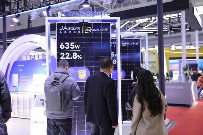 本次展會(huì),晶澳科技展出了DeepBlue4.0Pro系列產(chǎn)品。DeepBlue4.0Pro系列產(chǎn)品采用了晶澳科技自主研發(fā)的高效n型Bycium+鈍化接觸電池技術(shù),電池開路電壓達(dá)到733mV,量產(chǎn)效率達(dá)26%。同時(shí),DeepBlue4.0Pro組件還集成了SMBB技術(shù)、高密度封裝技術(shù)等提質(zhì)增效核心技術(shù),72版型組件功率可達(dá)635W,組件效率達(dá)22.8%,是目前行業(yè)182系列組件中功率最高的產(chǎn)品。