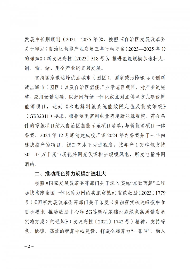 支持國家碳達(dá)峰試點(diǎn)城市(園區(qū))、國家減污降碳協(xié)同創(chuàng)新試點(diǎn)城市(園區(qū))以及自治區(qū)氫能產(chǎn)業(yè)示范區(qū)項目,對產(chǎn)業(yè)鏈完整、應(yīng)用場景明確、以源網(wǎng)荷儲一體化或點(diǎn)對點(diǎn)供電方式建設(shè)新能源項目,達(dá)到《水電解制氫系統(tǒng)能效限定值及能效等級》(GB32311)要求,根據(jù)制氫需用電量確定新能源規(guī)模。符合條件的綠氫項目納入自治區(qū)氫能示范項目清單,與新能源項目一體備案。2024年12月底前建成投產(chǎn)或2024年內(nèi)備案并于一年內(nèi)建成投產(chǎn)的項目。