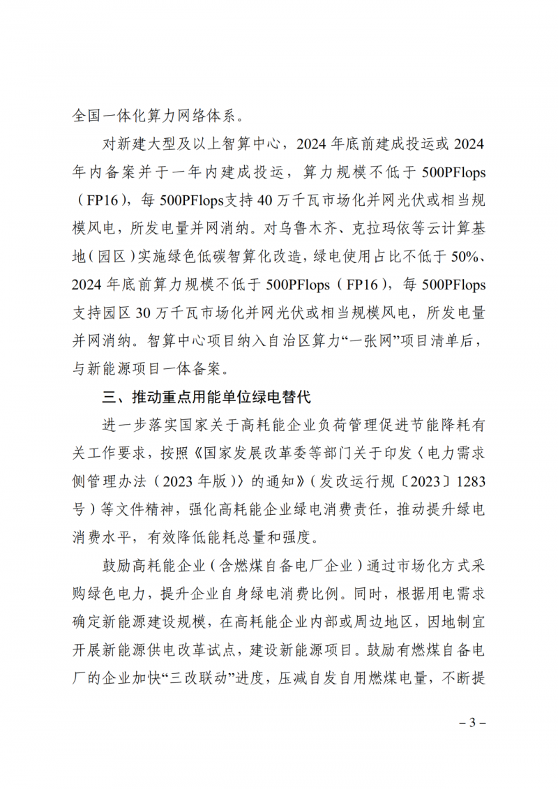 對新建大型及以上智算中心,2024年底前建成投運(yùn)或2024年內(nèi)備案并于一年內(nèi)建成投運(yùn),算力規(guī)模不低于500PFlops(FP16),每500PFlops支持40萬千瓦市場化并網(wǎng)光伏或相當(dāng)規(guī)模風(fēng)電,所發(fā)電量并網(wǎng)消納。對烏魯木齊、克拉瑪依等云計算基地(園區(qū))實(shí)施綠色低碳智算化改造,綠電使用占比不低于50%、2024年底前算力規(guī)模不低于500PFlops(FP16),每500PFlops支持園區(qū)30萬千瓦市場化并網(wǎng)光伏或相當(dāng)規(guī)模風(fēng)電,所發(fā)電量并網(wǎng)消納。
