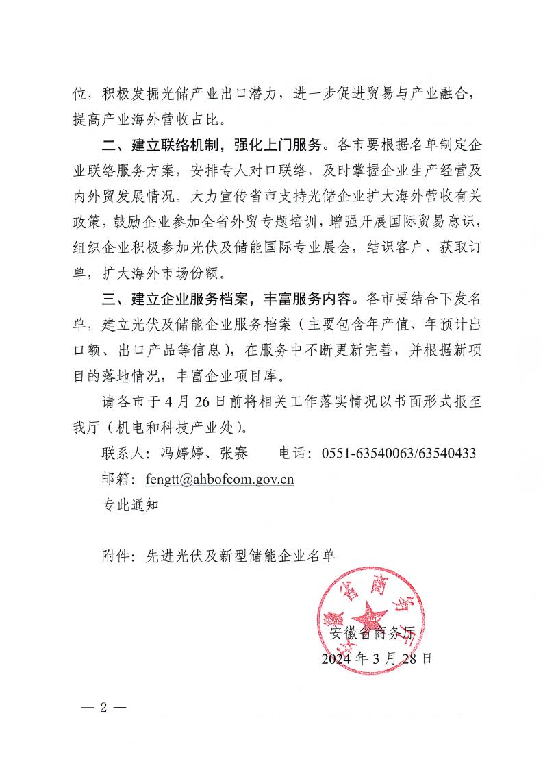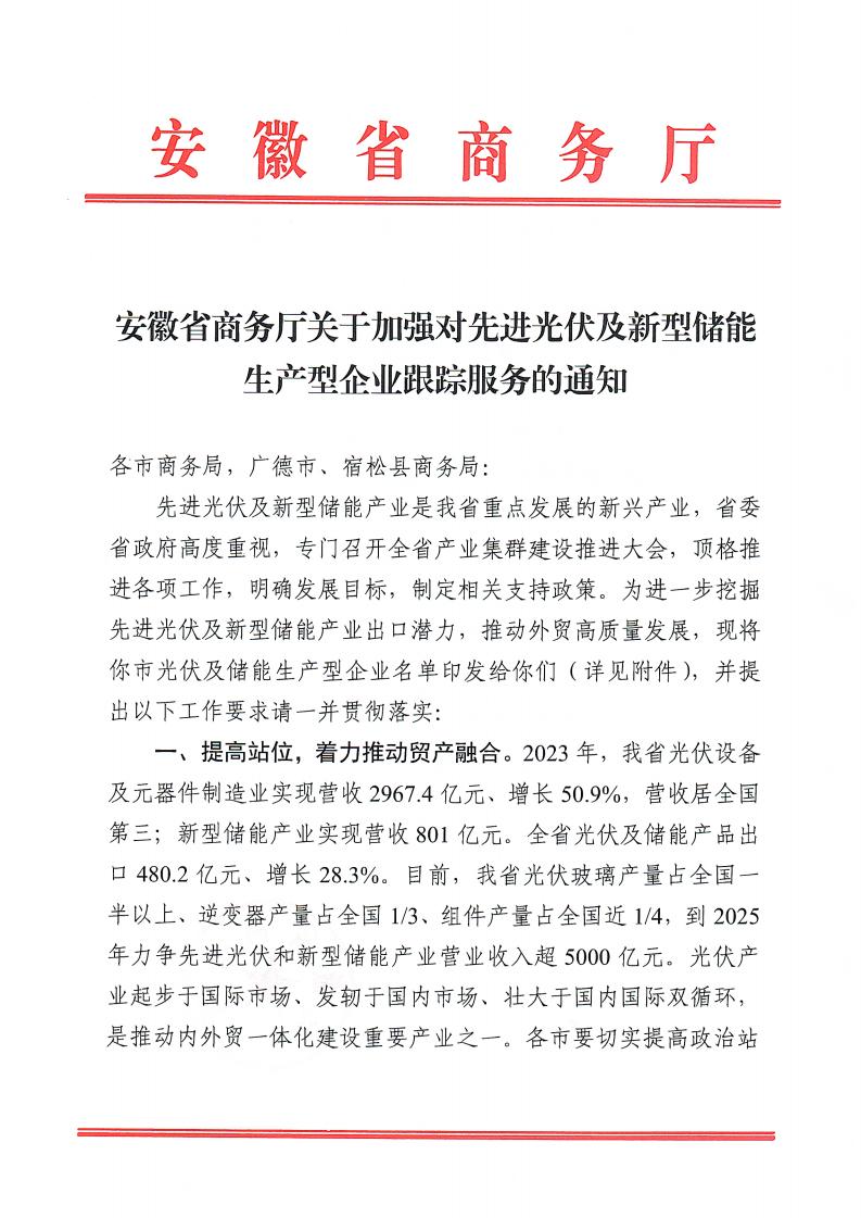 4月1日,安徽省商務(wù)廳發(fā)布關(guān)于加強(qiáng)對(duì)先進(jìn)光伏及新型儲(chǔ)能生產(chǎn)型企業(yè)跟蹤服務(wù)的通知。文件明確,2023年,我省光伏設(shè)備及元器件制造業(yè)實(shí)現(xiàn)營收2967.4億元、增長50.9%,營收居全國第三;新型儲(chǔ)能產(chǎn)業(yè)實(shí)現(xiàn)營收801億元。全省光伏及儲(chǔ)能產(chǎn)品出口480.2億元、增長28.3%。目前,我省光伏玻璃產(chǎn)量占全國一半以上、逆變器產(chǎn)量占全國1/3、組件產(chǎn)量占全國近1/4,到2025年力爭先進(jìn)光伏和新型儲(chǔ)能產(chǎn)業(yè)營業(yè)收入超5000億元。