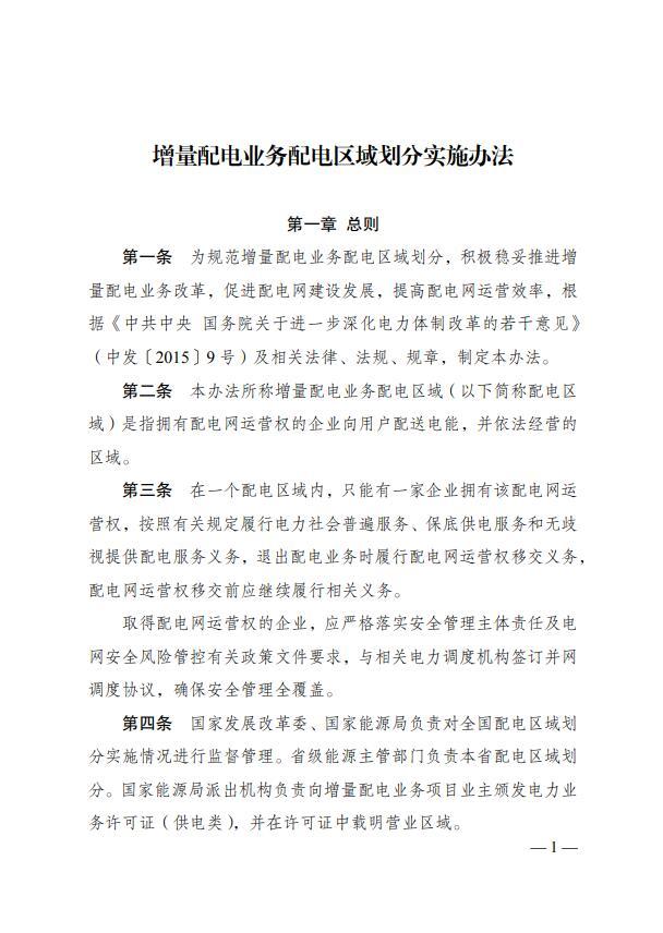 為規(guī)范增量配電業(yè)務(wù)配電區(qū)域劃分,積極穩(wěn)妥推進(jìn)增量配電業(yè)務(wù)改革,國(guó)家發(fā)展改革委、國(guó)家能源局修訂了《增量配電業(yè)務(wù)配電區(qū)域劃分實(shí)施辦法》。現(xiàn)印發(fā)給你們,請(qǐng)遵照?qǐng)?zhí)行?!对隽颗潆姌I(yè)務(wù)配電區(qū)域劃分實(shí)施辦法(試行)》(發(fā)改能源規(guī)〔2018〕424號(hào))同時(shí)廢止。