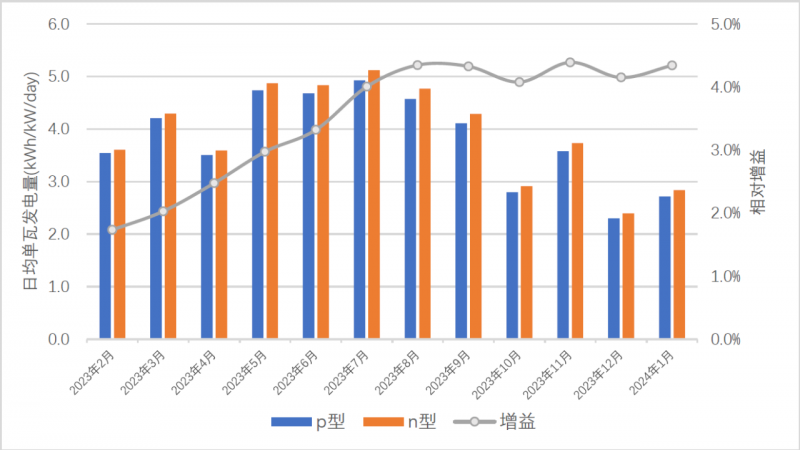 實(shí)證電站在2023年2月到2024年1月運(yùn)行期間,n型組件和p型組件整體的發(fā)電量情況如表1,兩種類型組件的單瓦發(fā)電量及增益對比情況如圖2所示。
